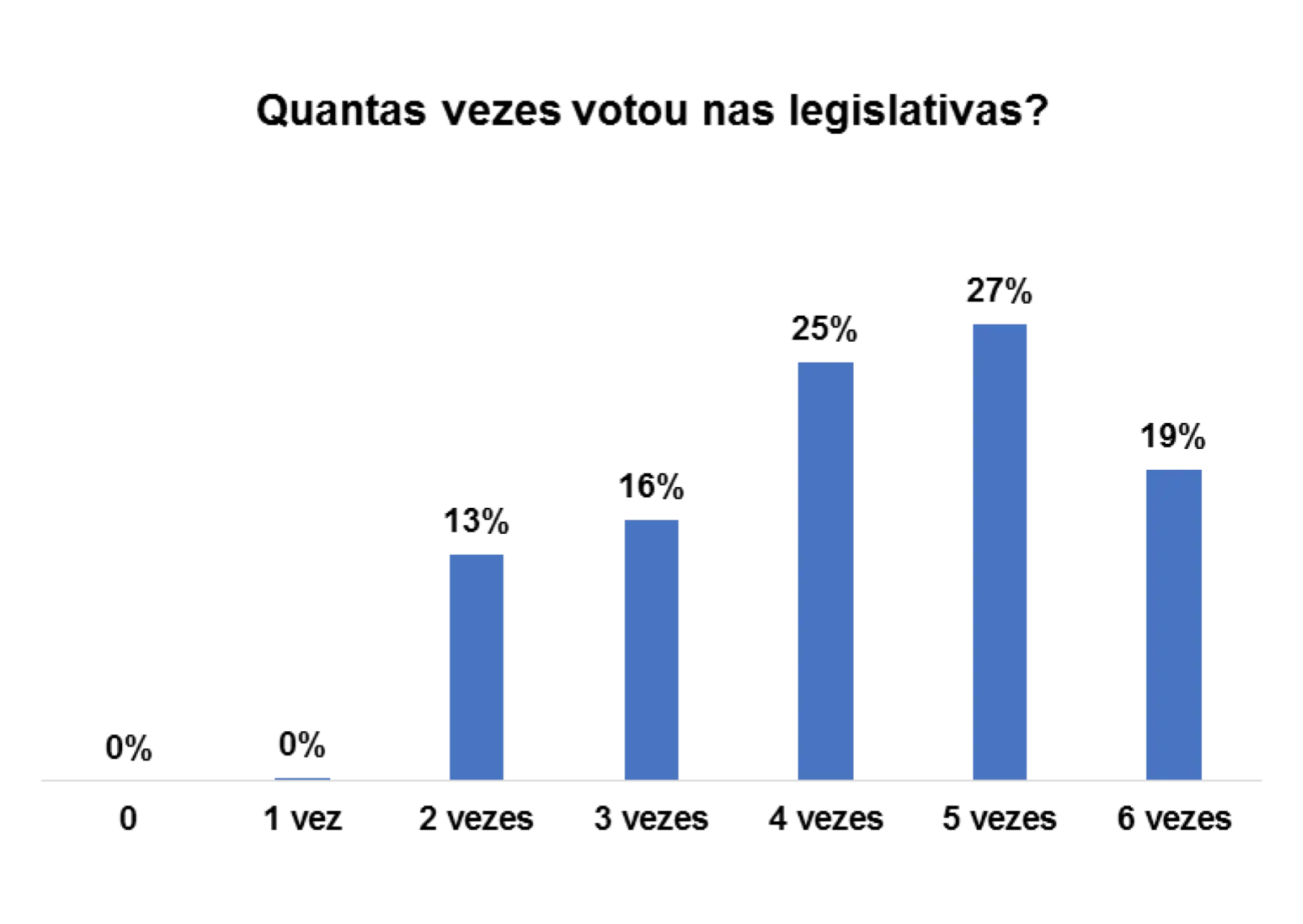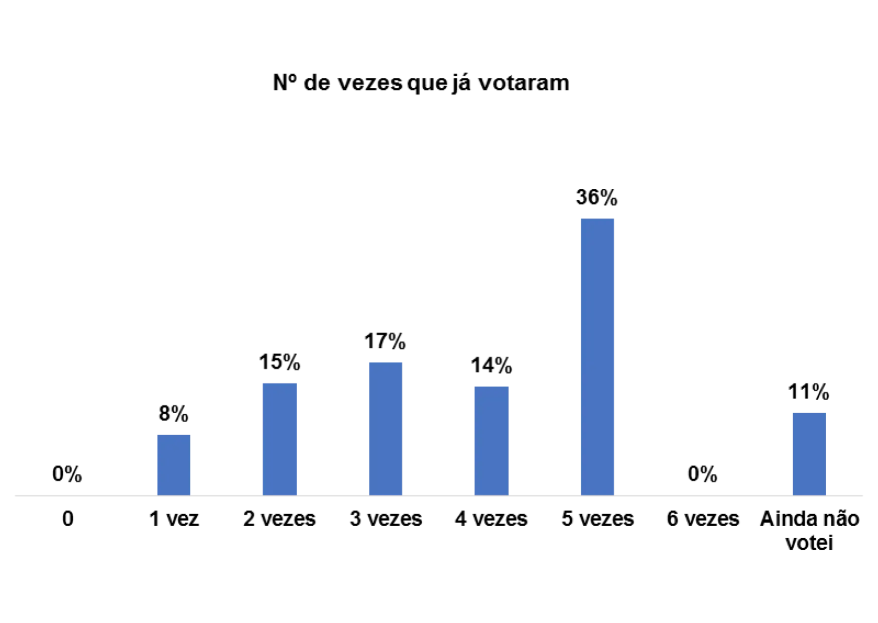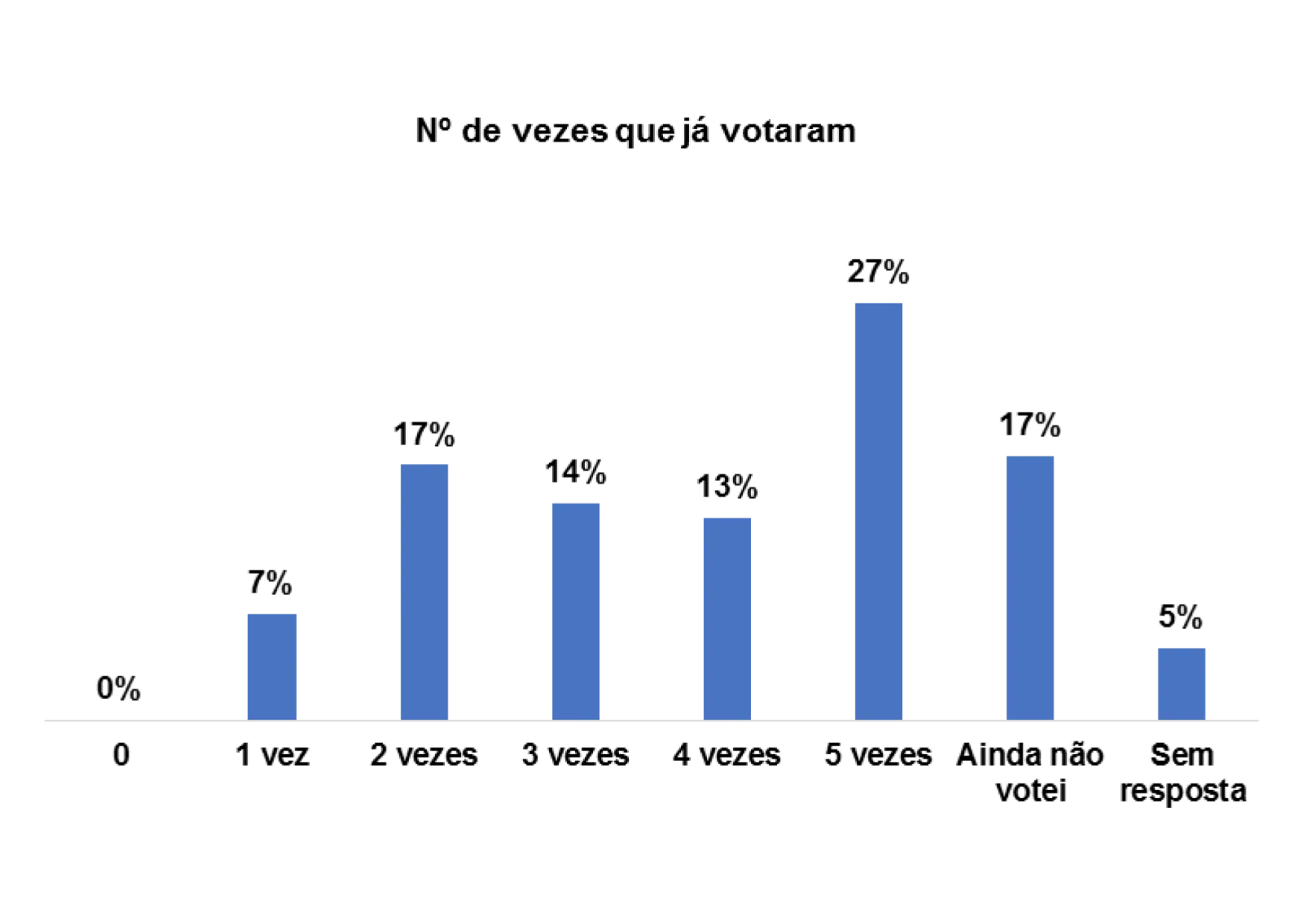 Quando questionadas/os quantas vezes já votaram, percebe-se que num universo de 3646 entrevistadas/os, 27% assumem que já votaram pelo menos 5 vezes e 17% pelo menos 2 vezes.
