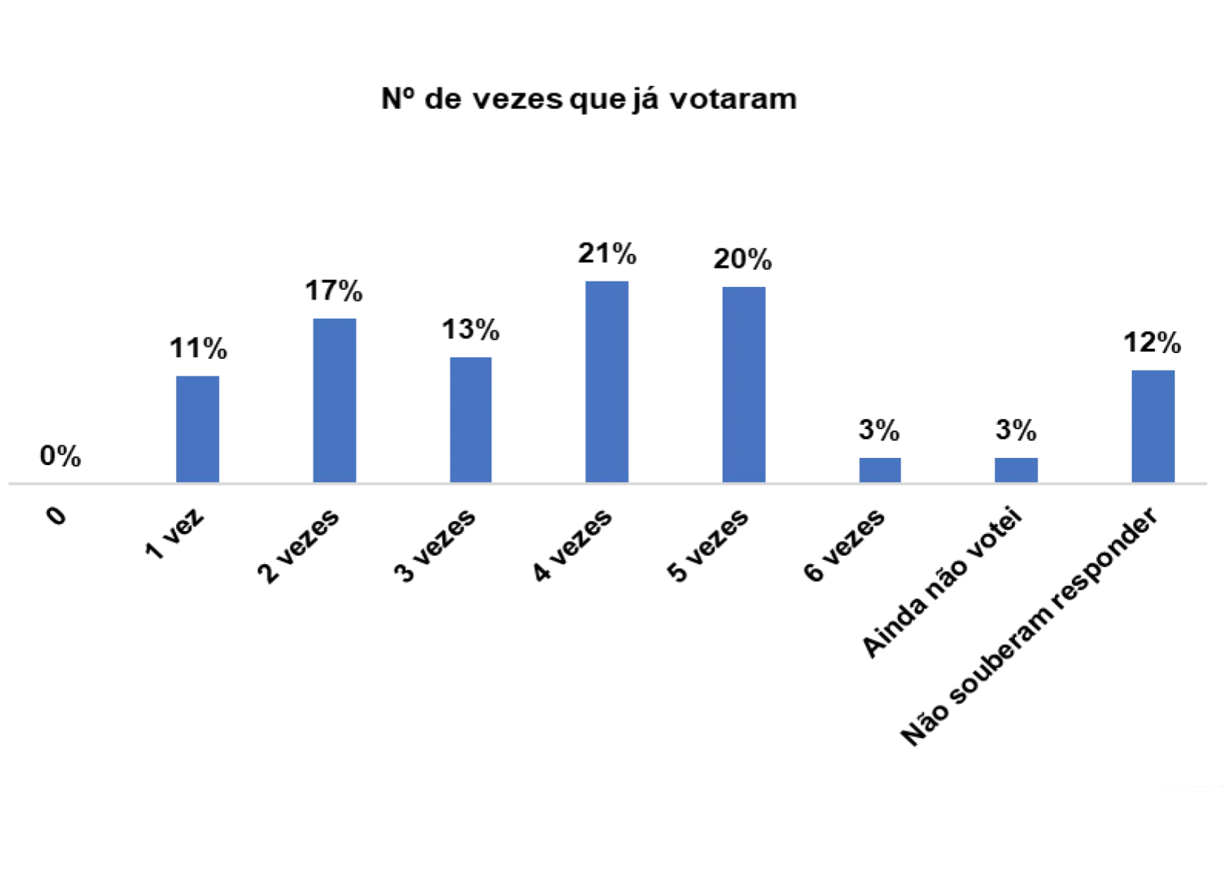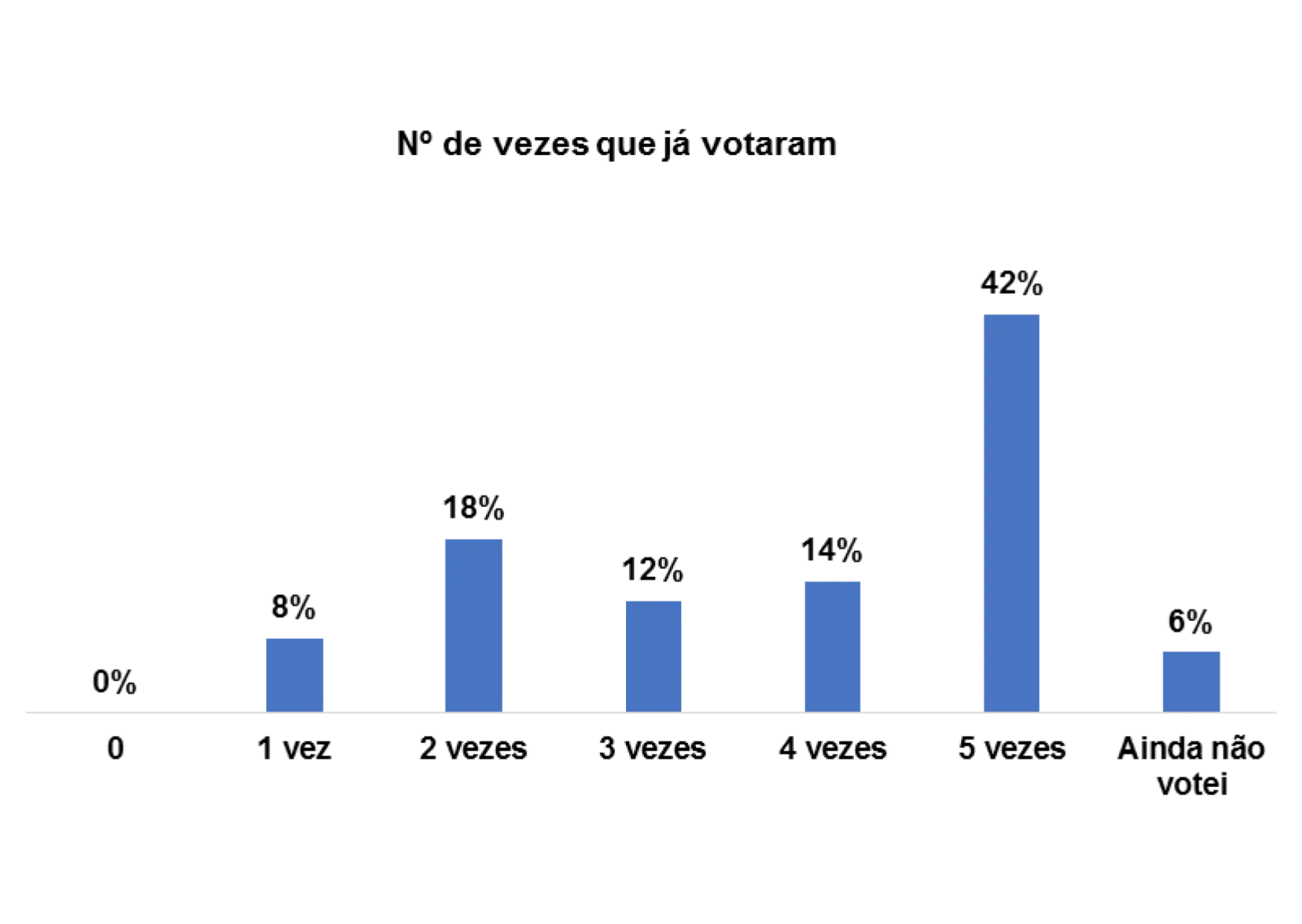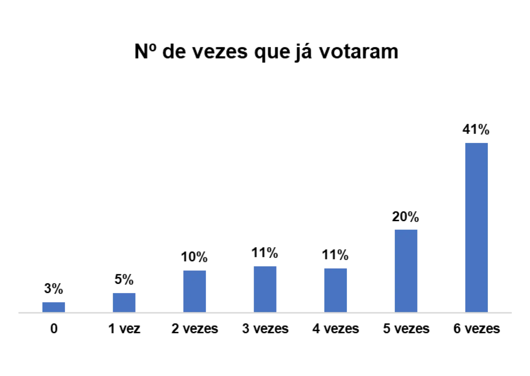 Quando questionadas/os quantas vezes já votaram, percebe-se que num universo de 3646 entrevistadas/os, 27% assumem que já votaram pelo menos 5 vezes e 17% pelo menos 2 vezes.