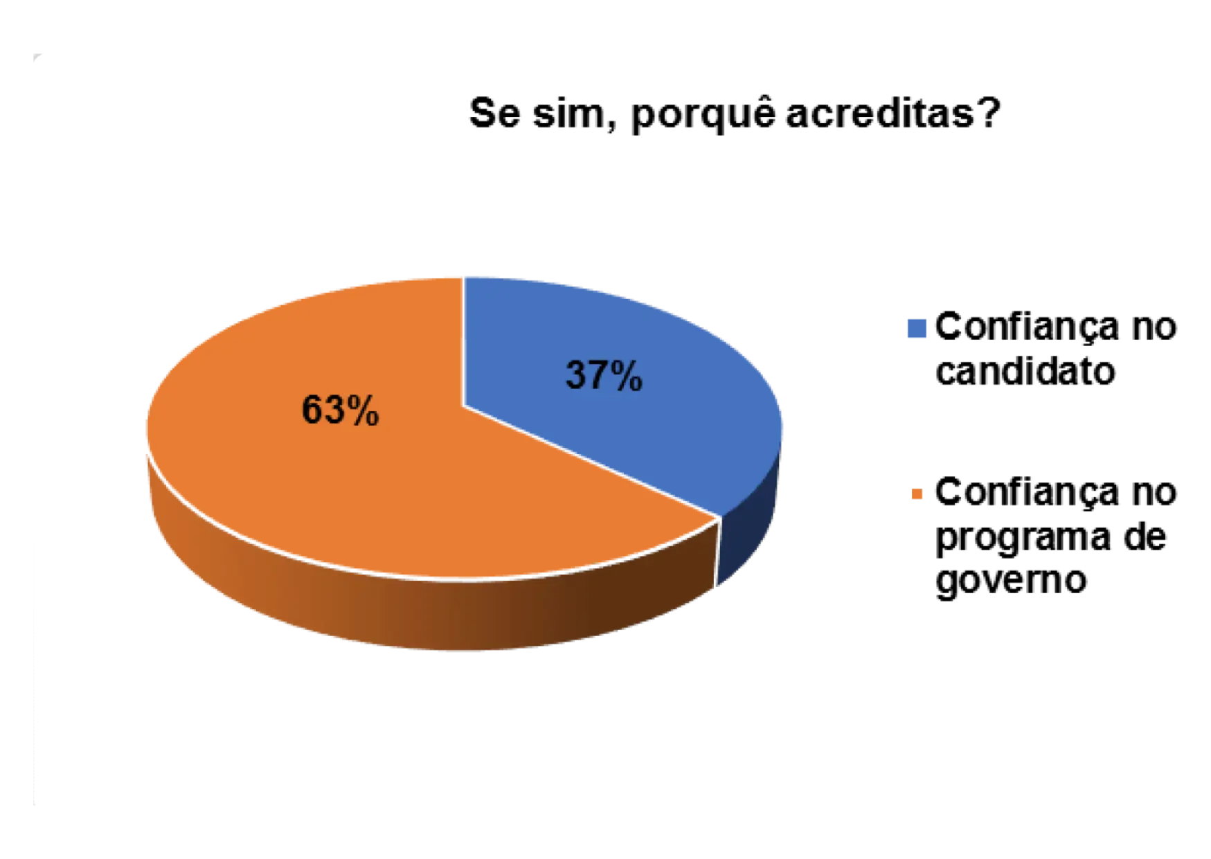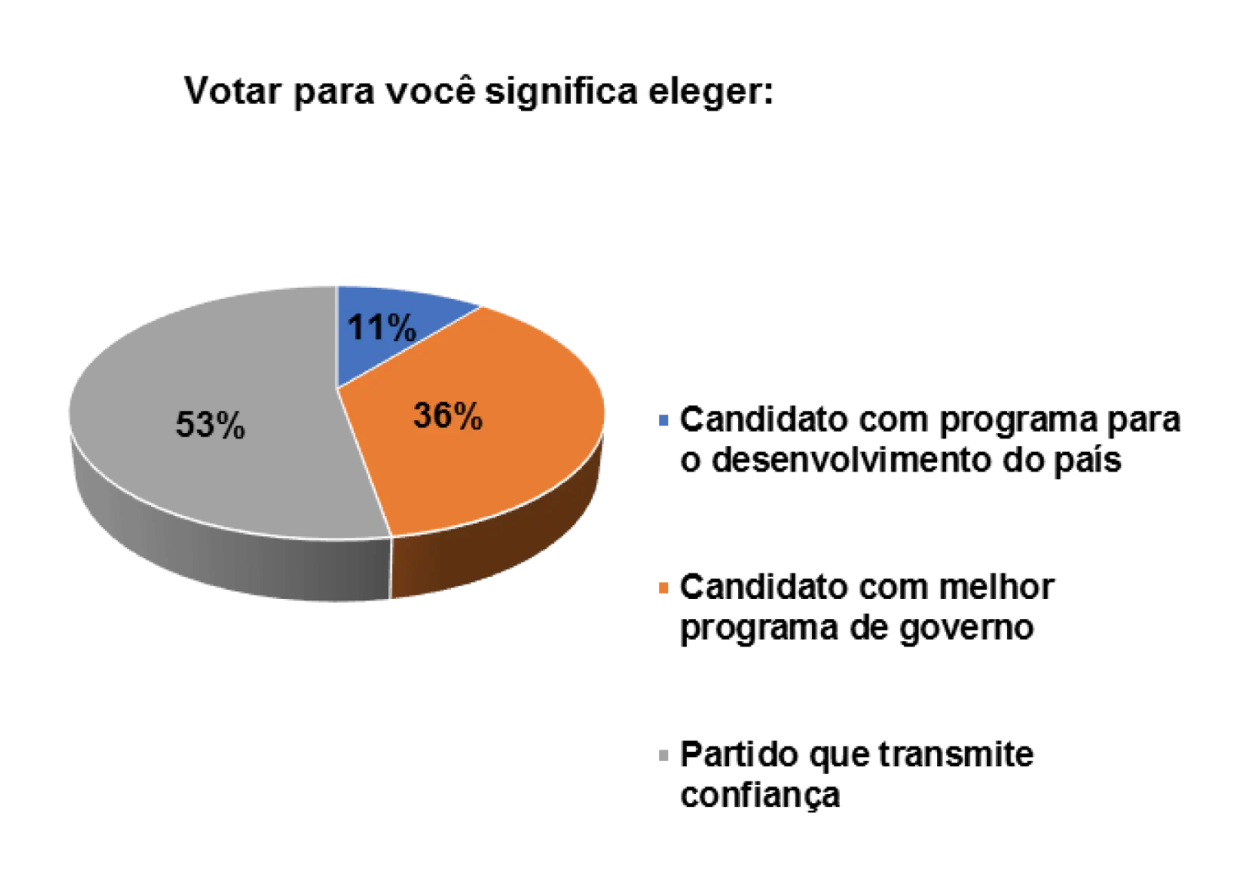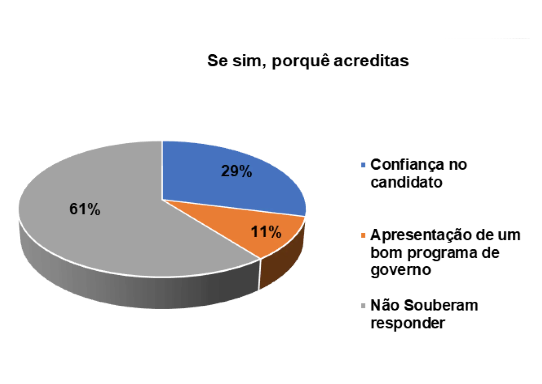 Portanto, segundo o gráfico 18, entre os eleitores entrevistados que afirmam acreditar nas promessas eleitorais dos candidatos nas eleições, 29% justificam a confiança no candidato como razão, 11% consideram porque apresentou um bom programa de governo, enquanto 61% não souberam responder.
