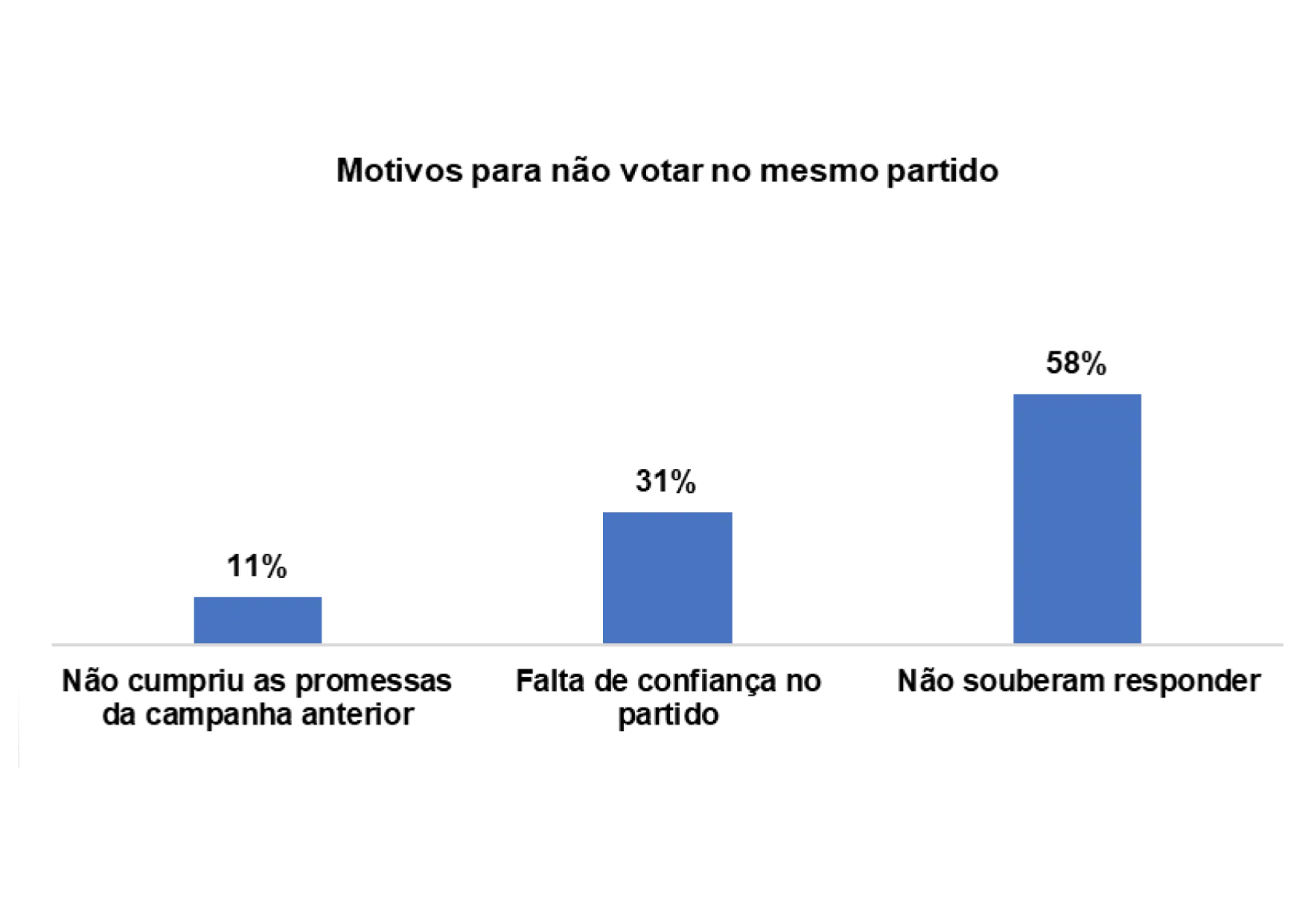 E os/as entrevistados/as que afirmam que não votaram no mesmo partido nas últimas eleições pelos seguintes motivos: não cumpriu as promessas da campanha anterior (11%) e a falta de confiança no partido (31%).