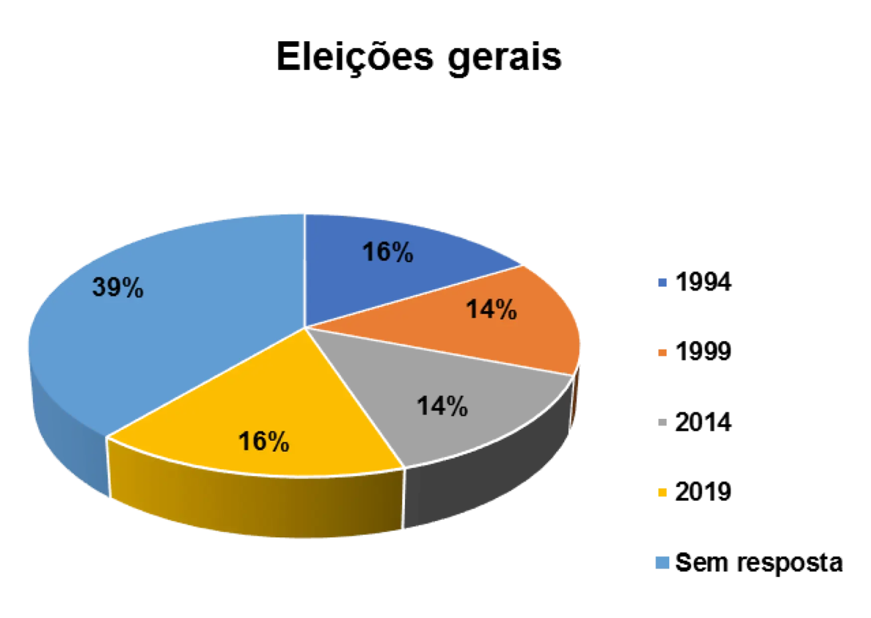 Em relação a participação nas eleições realizadas no país, percebe-se que 16% afirmam ter votado nas eleições gerais em 1994, 14% nas eleições de 1999, 14% nas eleições gerais de 2014 e 16% nas eleições gerais de 2019.