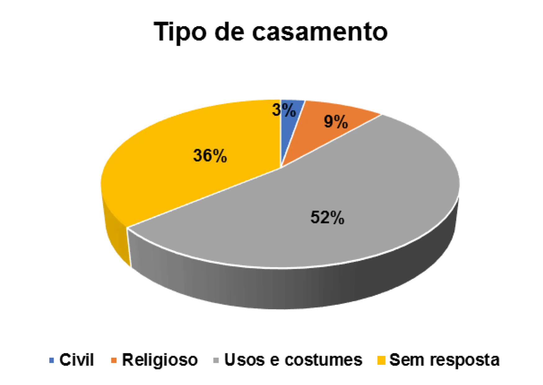 Entre os casados, o tipo de casamento predominante é o casamento de usos e costumes, representado por 52%.